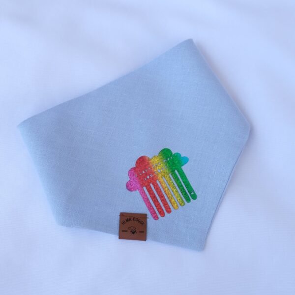 This reversible linen bandana features a Pride Flag Rainbow Progress iron on patch on one side and a Rainbow or “Love who you are” design on the other side, adding a touch of cuteness and love to your fur’s look.